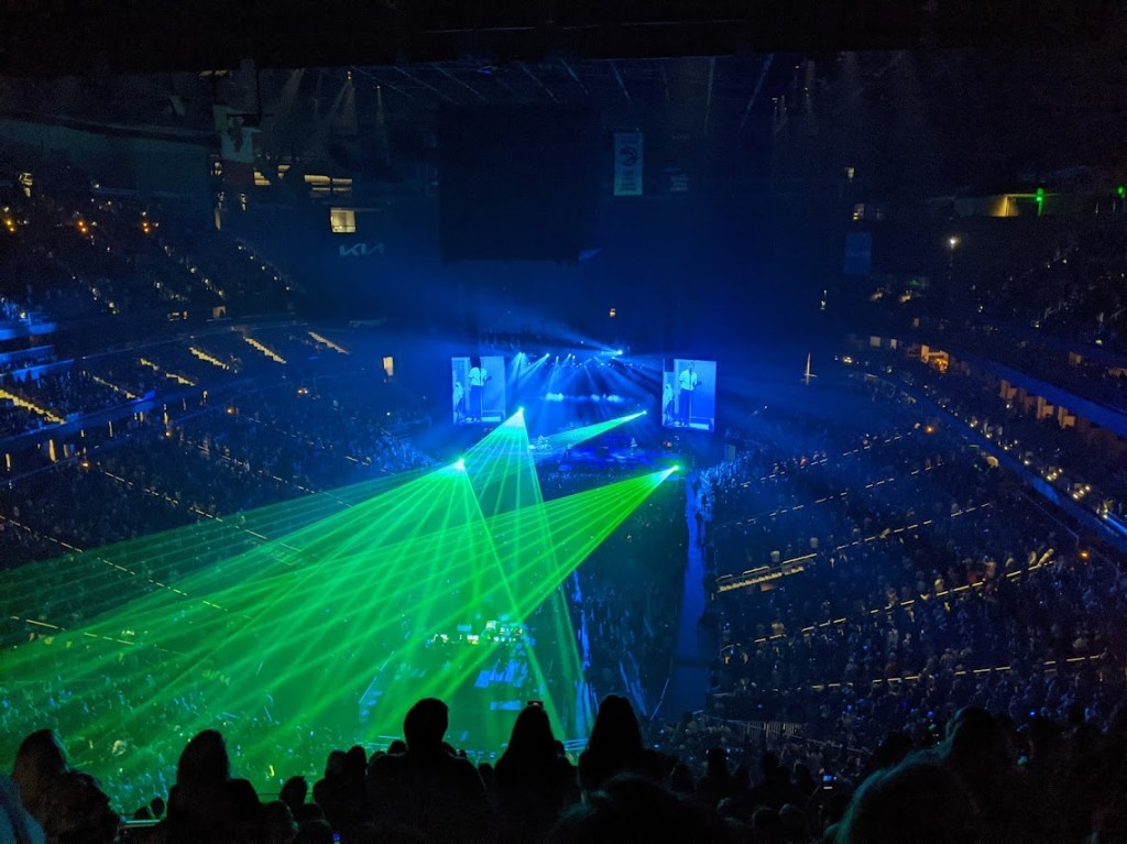 Our seats were up in the nosebleeds of the arena but we were facing the stage which was great. Hubs and I both looked at the mass of people in the pit, standing only area, and thought “no thanks”. Standing in a crowd like that seems like torture at this point in our lives! I mean, we are not 19 anymore moshing in the Warehouse at APU’s LollapAzusa (our Christian college answer to Lollapalooza) or shoegazing to Smashing Pumpkins at the Anaheim Pond. However, the superfan in the row in front of us probably wished she was down there. We were excited to be there, my kids were excited to be there, that girl’s enthusiasm was unmatched and it was a joy to behold.